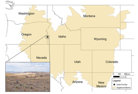Map highlighting the sagebrush ecosystems and the site of collection of IDT3 within the Soda Fire site (burned in 2015) in Idaho, USA. Sagebrush ecosystems (also called the “Sagebrush Biome” per Rigge et al. 2020) currently cover an estimated range of 653,316 km2. The inset shows a landscape photo of the Soda Fire site.